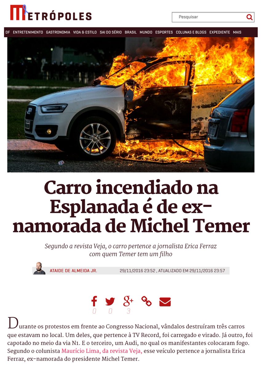 Descobriram que um dos carros incendiados ontem na Esplanada é de uma ex-namorada de Temer: